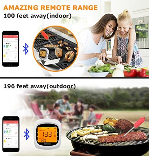 SOMKER THERMOMETER- PHONE REMOTE MONITORING FOOD: this BBQ thermometer will remind you at the very first time, All of these operations can be remotely monitored by your Phone or iPad, Indoor 100ft, Outdoor 170ft (may vary depending on the surroundings). So you can do any things while cooking!